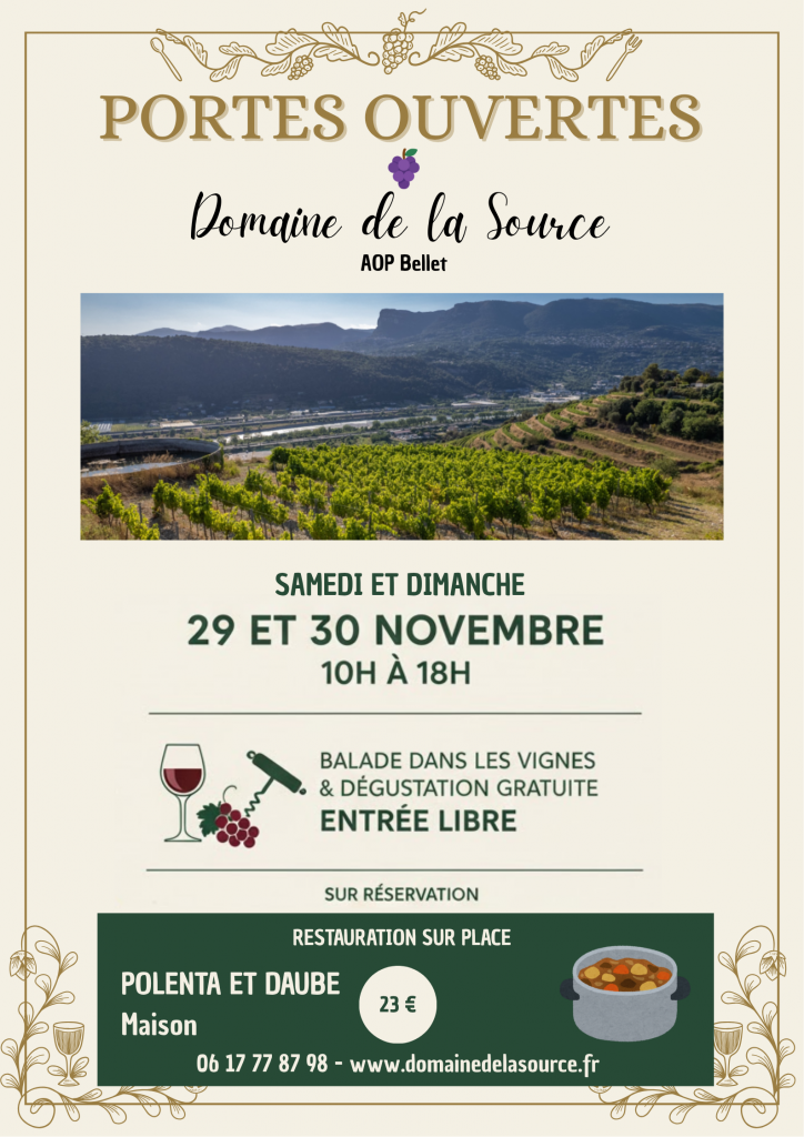 Nous sommes heureux de vous accueillir pour nos Portes Ouvertes le samedi 29 et le dimanche 30 novembre, de 10h à 18h, au cœur du vignoble AOP Bellet. Deux journées placées sous le signe du partage, de la découverte et de la convivialité.